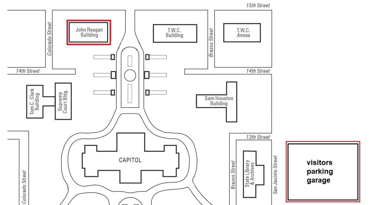 A lot of folks may not have had to testify in the John Reagan building before. it is located to the NORTH of the capitol on the map below, Need to approach the main intrance from the GROUND level. The tunnel in E1 requires a badge, apparently (My apologies for directing some folks that way earlier.